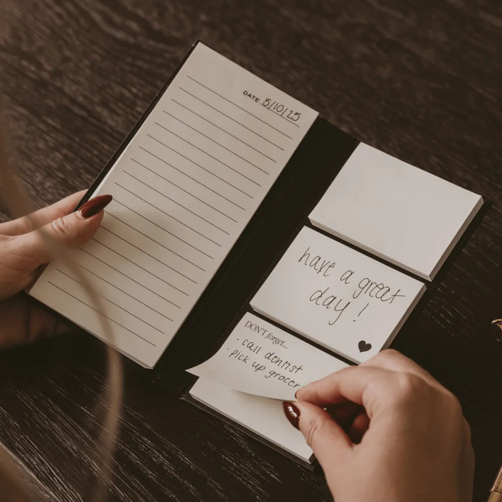 Stay organized wherever you go with our portable sticky notes and notepad booklet. Designed for everyday convenience, it slips easily into your bag so you can jot down thoughts, make quick lists, or leave a sweet love note in a lunch box. Inside, three sticky note styles and a lined tear-away notepad give you plenty of ways to capture what matters. Finished with a scratch-resistant surface, this thoughtfully functional booklet keeps your day running smoothly at home, work, or on the go.