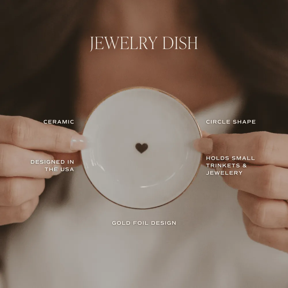 Keep your jewelry and small treasures beautifully displayed with our Gold Heart Trinket Tray. This ceramic catch all tray features a simple, chic gold foil heart design, making it the perfect ring dish for your dresser, vanity, or nightstand. With its clean and classic look, this small trinket dish is ideal for storing rings, earrings, and other delicate pieces – a thoughtful addition to any room and a sweet, practical gift.