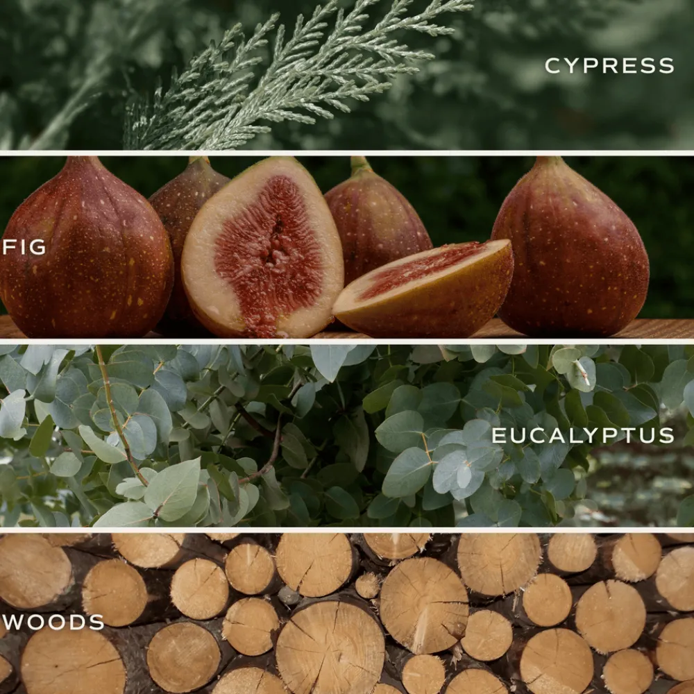 - Middle: Ripe Fig, Eucalyptus, Clove