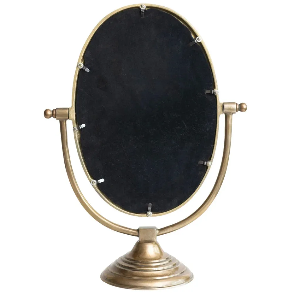 Bring timeless elegance to your vanity or console with this aluminum framed mirror on a stand, finished in a warm antique brass. The oval mirror sits atop a sculptural base with subtle detailing, blending classic design with modern utility. Perfect for a bedroom, bathroom, or entryway vignette, this mirror doubles as both a functional piece and a decorative accent. Its compact size makes it easy to style on dressers, side tables, or shelves, adding character and refinement to any space.